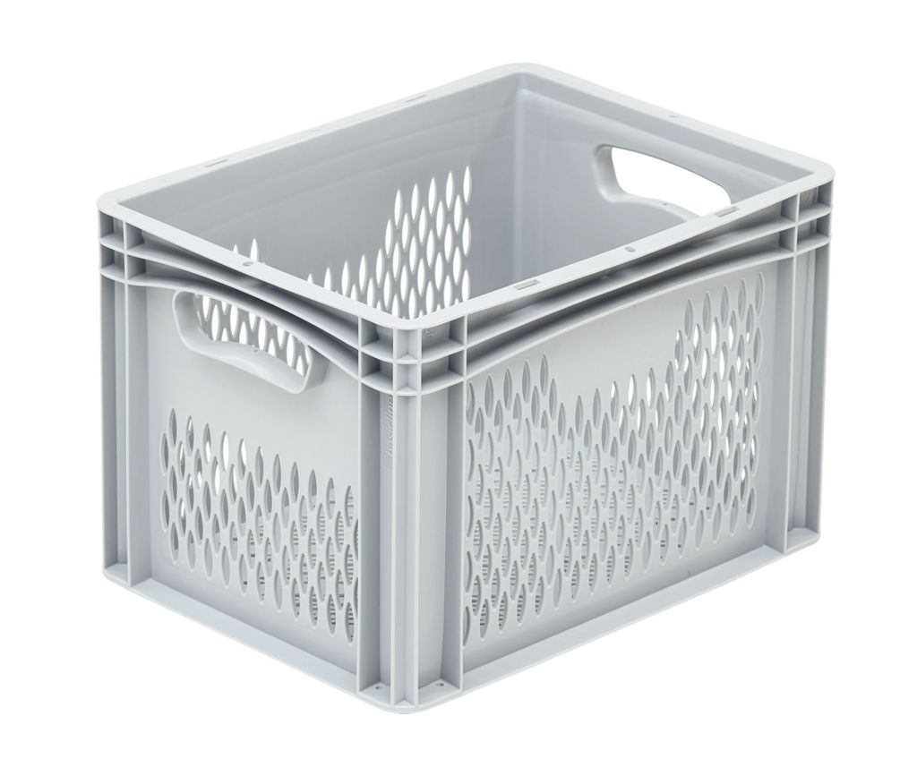 Basicline storage crate, 400x300x270 mm, perforated bottom and sides, open handgrips