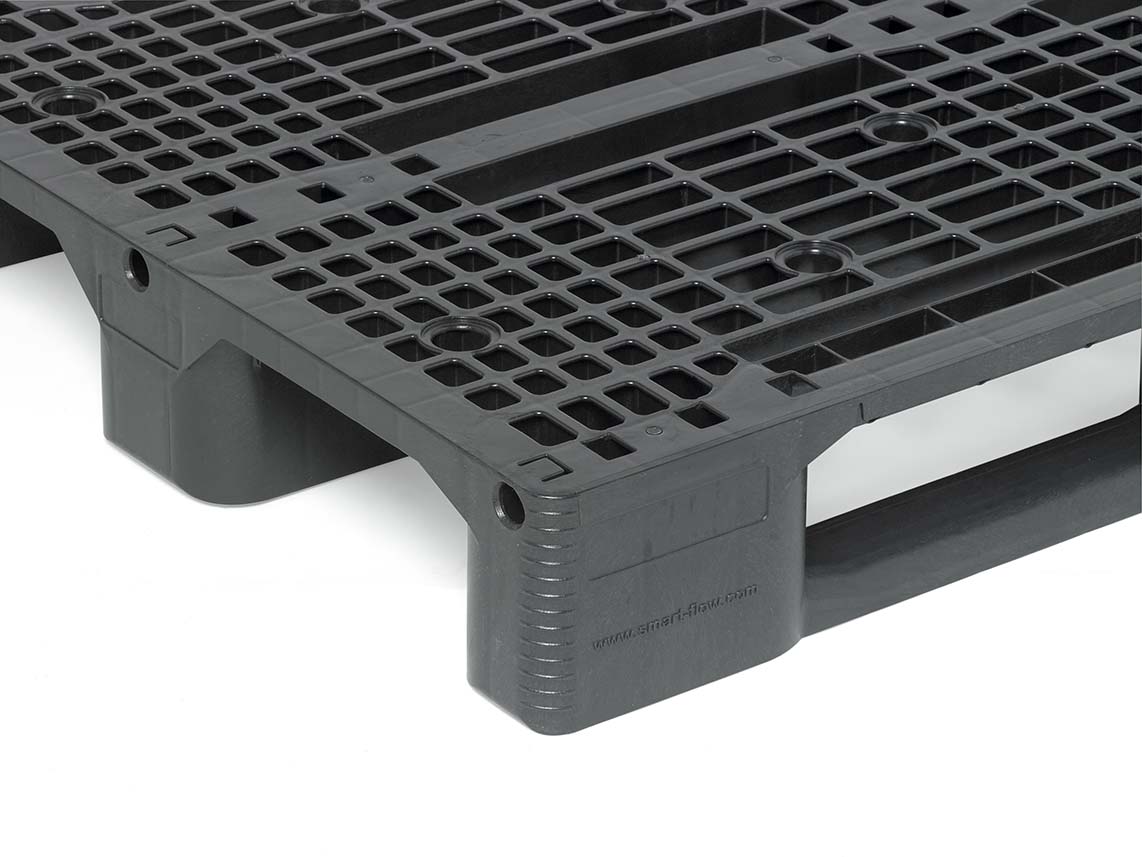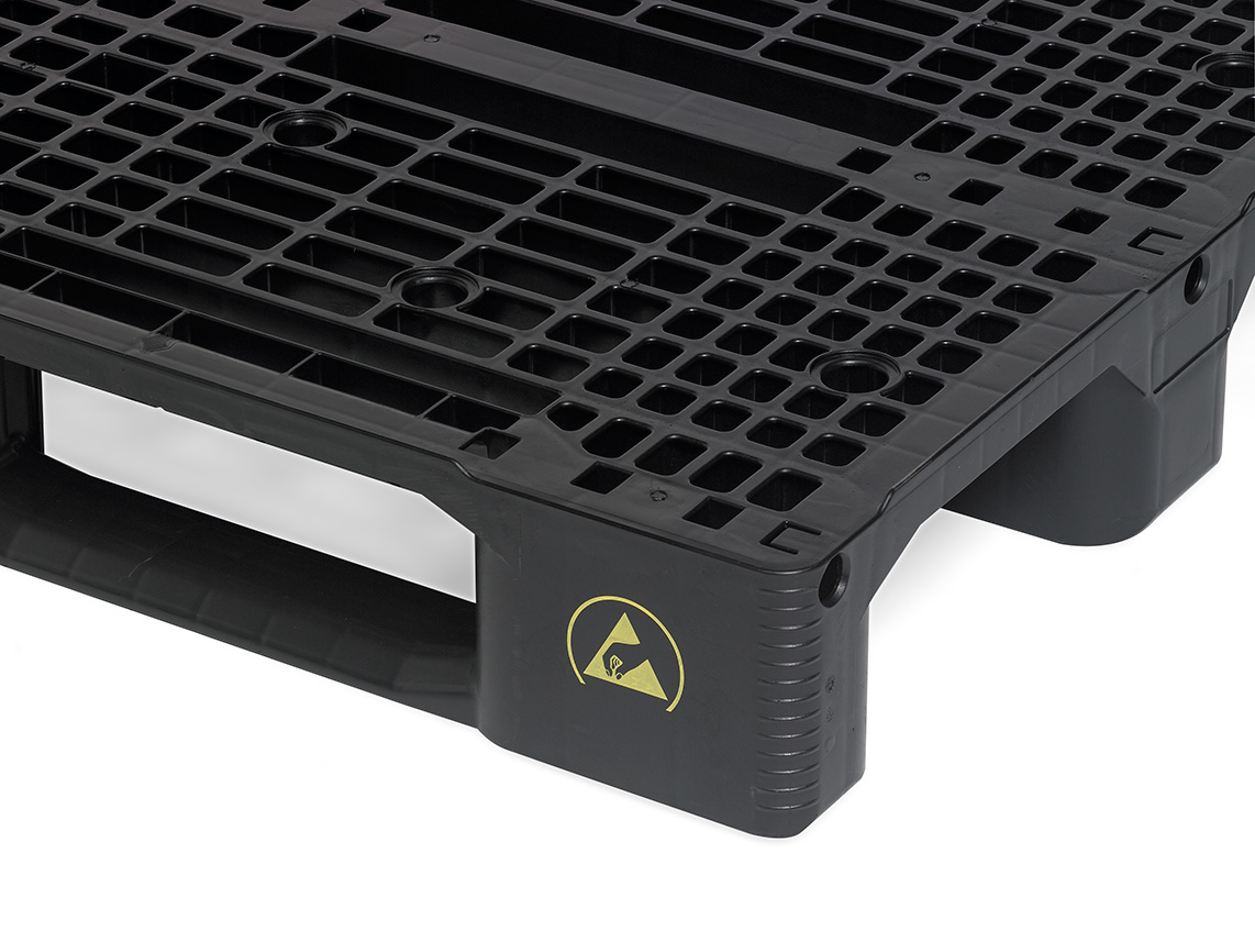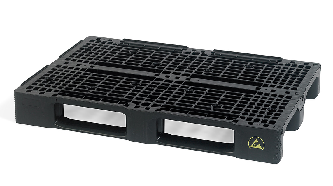 This medium pallet with 3 skids and ESD protection is injection moulded in one piece, making it extremely heavy-duty and durable. It can be used on racks and conveyor belts.